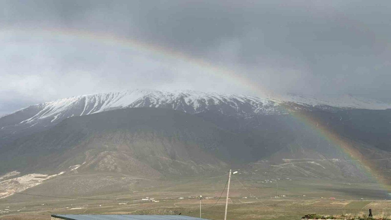 Ağrı Dağı’nın eteklerinde beliren gökkuşağı, renklerin ahengiyle görsel bir şölen sundu. Doğayla bütünleşen bu manzara, vatandaşların ilgisini çekti. Gökkuşağının Ağrı Dağı’nın heybetli siluetiyle birleşmesi, kartpostallık görüntüler ortaya çıkardı. Ağrı Dağı’nın etrafında nadiren görülen bu doğa olayı, izleyenlere de görsel bir şölen sundu.