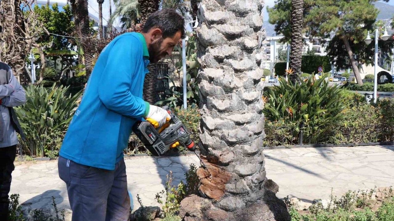 Alanya Belediyesi Park ve Bahçeler Müdürlüğü, kent genelindeki hurma ve palmiye ağaçlarını tehdit eden zararlılara karşı modern, çevreci ve uzun vadeli bir yöntem olan endoterapi uygulamasını gerçekleştiriyor.