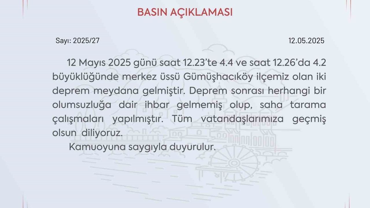 "12 Mayıs 2025 günü saat 12.23’te 4.4 ve saat 12.26’da 4.2 büyüklüğünde merkez üssü Gümüşhacıköy ilçemiz olan iki deprem meydana gelmiştir. Deprem sonrası herhangi bir olumsuzluğa dair ihbar gelmemiş olup saha tarama çalışmaları yapılmıştır. Tüm vatandaşlarımıza geçmiş olsun diliyoruz."