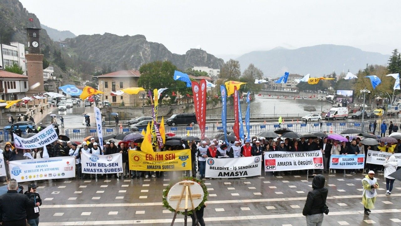 Amasya’da 1 Mayıs Emek ve Dayanışma Günü kutlamalarının adresi ise Yavuz Selim Meydanı’ydı. Sağanak yağmur altında şemsiyelerle gerçekleştirilen miting de 1 Mayıs tertip komitesi tarafından konuşmaların yapılmasının ardından yağmur altında söylenen türkülerle halay çekildi. Sağlık Emekçileri Sendikası Başkanı Satılmış Ayan, "Olumsuz hava şartlarına rağmen alanları dolduran, bu güzel günü kutlayan tüm arkadaşlara selam olsun" dedi.