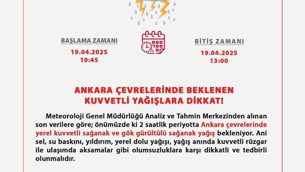 Ankara Valiliği tarafından yapılan açıklamada, Ankara Bölge Tahmin ve Erken Uyarı Merkezi verilerine göre başkent çevresinde beklenen kuvvetli yağışlara karşı dikkatli olunması gerektiği belirtildi. Başkentlileri uyaran paylaşımda, "Ani sel, su baskını, yıldırım, yerel dolu yağışı, yağış anında kuvvetli rüzgar ile ulaşımda aksamalar gibi olumsuzluklara karşı dikkatli ve tedbirli olunmalıdır" ifadelerine yer verildi.