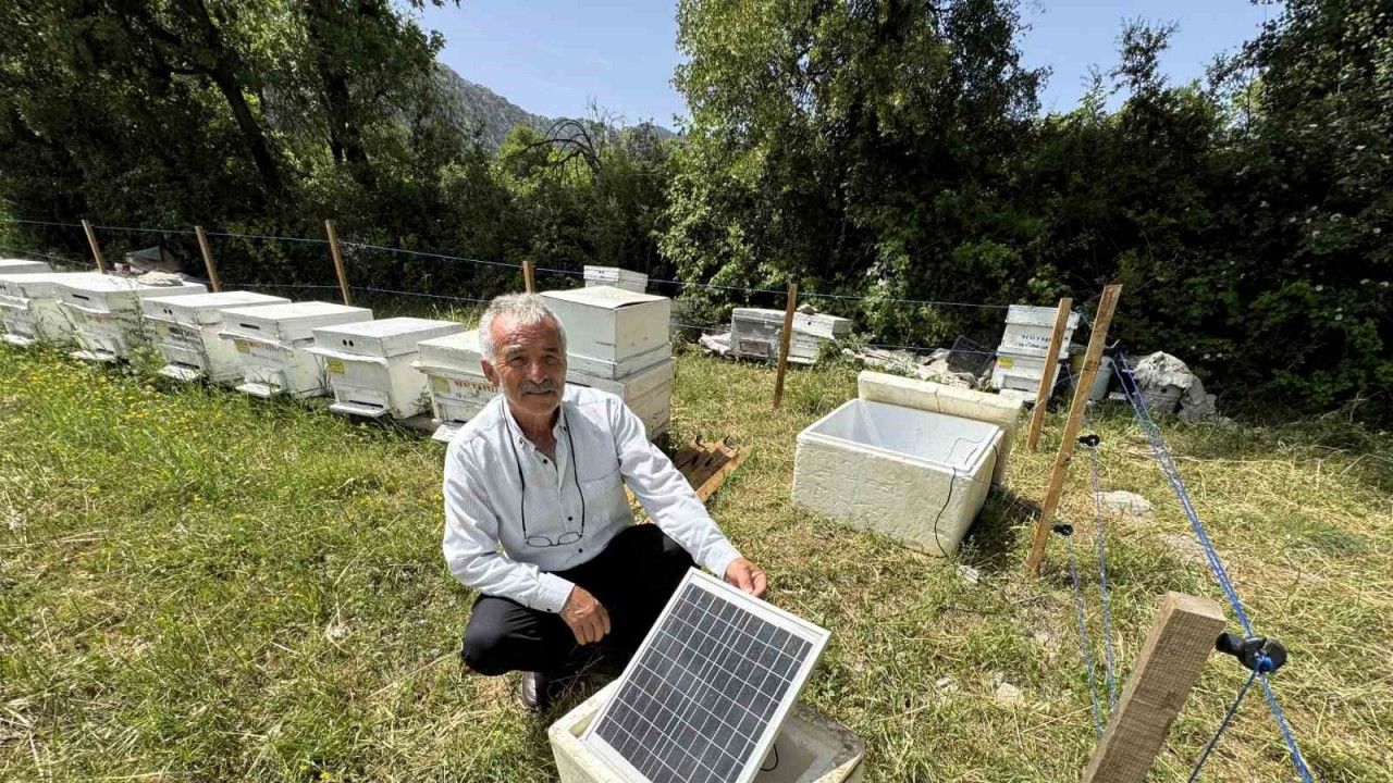 Antalya’nın İbradı ilçesi Ürünlü Mahallesi’nde yaşayan arıcı Mesut Şanlı, kovanlarının etrafını ayılardan korumak için elektrikli tellerle çevirip ışıklandırma yaptı.