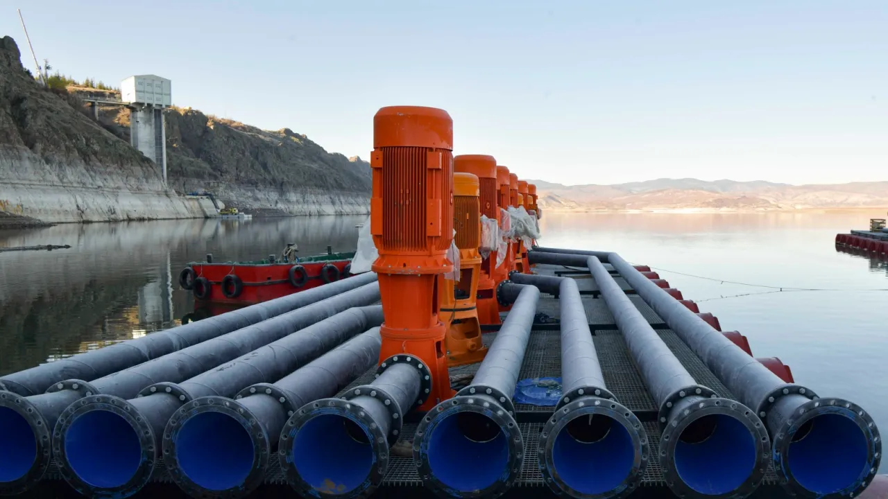 'Çamlıdere Barajı'nda yaklaşık 400-500 milyon metreküp su olduğunda bunun yüzde 20'si hatta daha fazlası da bu ölü hacim dediğimiz, aslında su alma yapısının altında kalan kısım. Burada herhangi bir sorun yok. Sadece suyu kendi cazibesiyle kanala aktaramıyoruz. Onu aktarabilmek için de bir sistem kurulması gerekiyor. Bu sistemde bu sol tarafımda gördüğümüz yüzer platformlar vasıtasıyla dikey milli pompalarla suyu alttan alıyoruz ve yukarıdaki su alma yapısının içerisine boşaltıyoruz. Oradan da tünele girip Ankara'ya su geliyor. Burada yaklaşık olarak dediğim gibi 110 milyon metreküp civarında bir rezerv var. Bu rezerv Ankara için önemli bir rezerv. Özellikle kurak dönemlerde başvurulan rezervlerden bir tanesi.'
