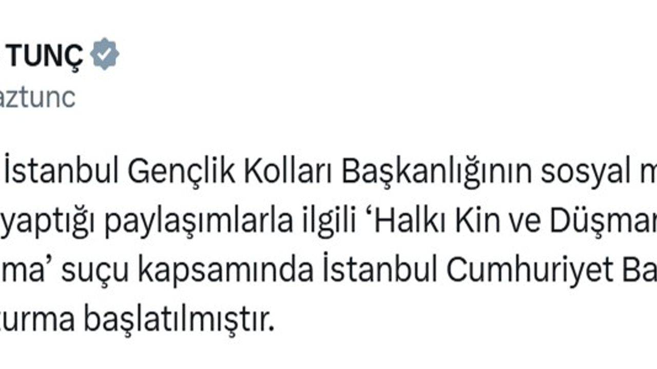 Adalet Bakanı Yılmaz Tunç, Zafer Partisi İstanbul Gençlik Kolları Başkanlığı’na sosyal medyada ‘Halkı Kin ve Düşmanlığa Tahrik veya Aşağılama’ suçu kapsamında soruşturma açıldığını duyurdu.