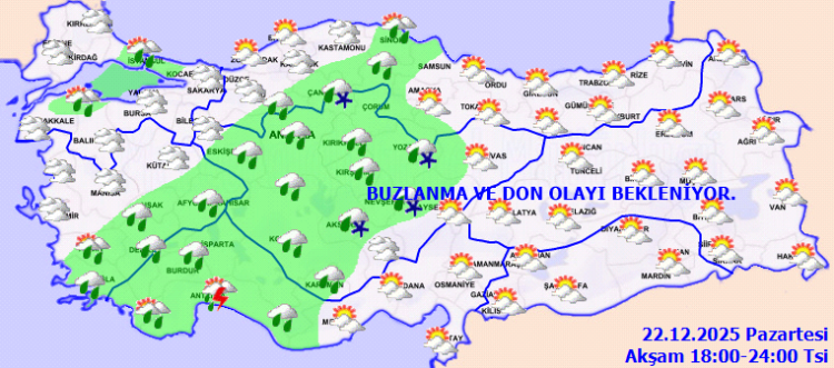 Sabah ve gece saatlerinde kuzey, iç ve doğu bölgelerde buzlanma, don, pus ve sis beklenirken, hava sıcaklıklarının ülke genelinde mevsim normalleri civarında seyredeceği belirtilirken, rüzgârın ise genellikle güney yönlerden hafif, zaman zaman orta kuvvette esmesi öngörüldü.