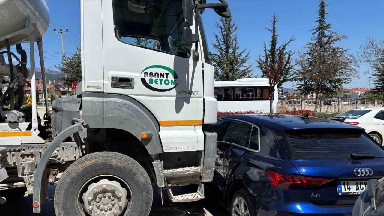 Kaza, Beşkavaklar Mahallesi mevkii İzzet Baysal Devlet Hastanesi Bulvarı üzerinde meydana geldi. Edinilen bilgiye göre, yol kenarından geri manevra yapan Zekai K. yönetimindeki 14 GD 029 plakalı beton mikser, Esranur Y. idaresindeki 14 ACY 112 plakalı otomobil ile çarpıştı. Kazada otomobil sürücüsü hafif yaralandı. İhbar üzerine olay yerine sağlık ve polis ekipleri sevk edildi. Hafif yaralı Esranur Y.’ye sağlık ekipleri ambulans içerisinde müdahalede bulundu. Kaza nedeniyle aksayan trafik otomobilin çekici ile kaldırılmasıyla normale döndü. Kazayla ilgili inceleme başlatıldı.