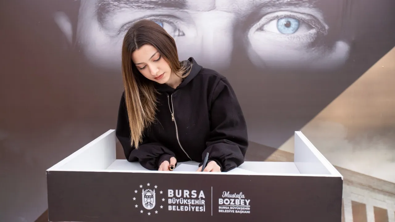 Bursalılar, Ata'ya duydukları özlem ve sevgilerini Büyükşehir Belediyesi'nin kentin farklı noktalarına kurduğu anı defteri stantlarıyla satırlara döküyor.