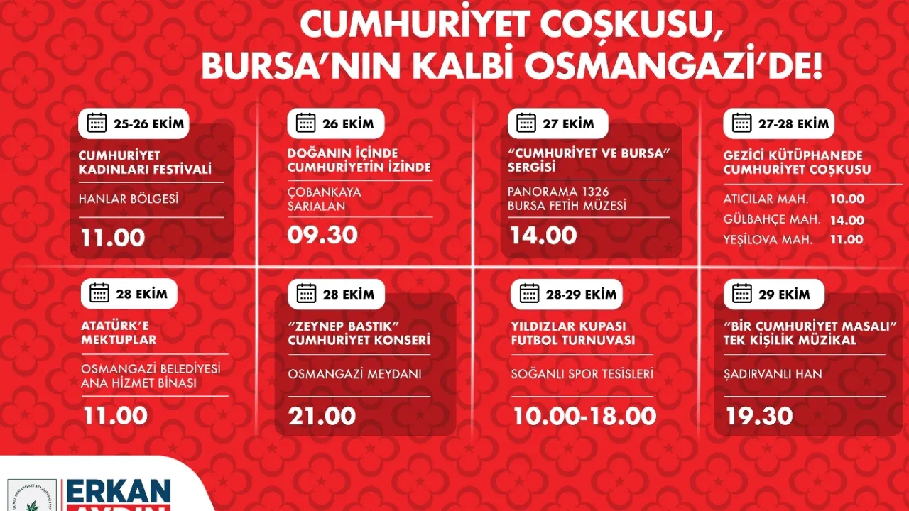 Osmangazi Belediyesi, 29 Ekim Cumhuriyet Bayramı kutlamalarının tüm ilçeyi sarması ve vatandaşların 102'nci yıl coşkusunu doyasıya yaşaması için zengin bir program hazırladı. 25 Ekim Cumartesi günü başlayacak ve 29 Ekim Çarşamba günü son bulacak etkinlikler, Osmangazi'nin dört bir yanında renkli görüntülere sahne olacak. Osmangazi Belediye Başkanı Erkan Aydın'ın yenilikçi anlayışıyla hazırlanan kapsamlı program, ilçede Cumhuriyet ruhuna yeni bir soluk kazandıracak.