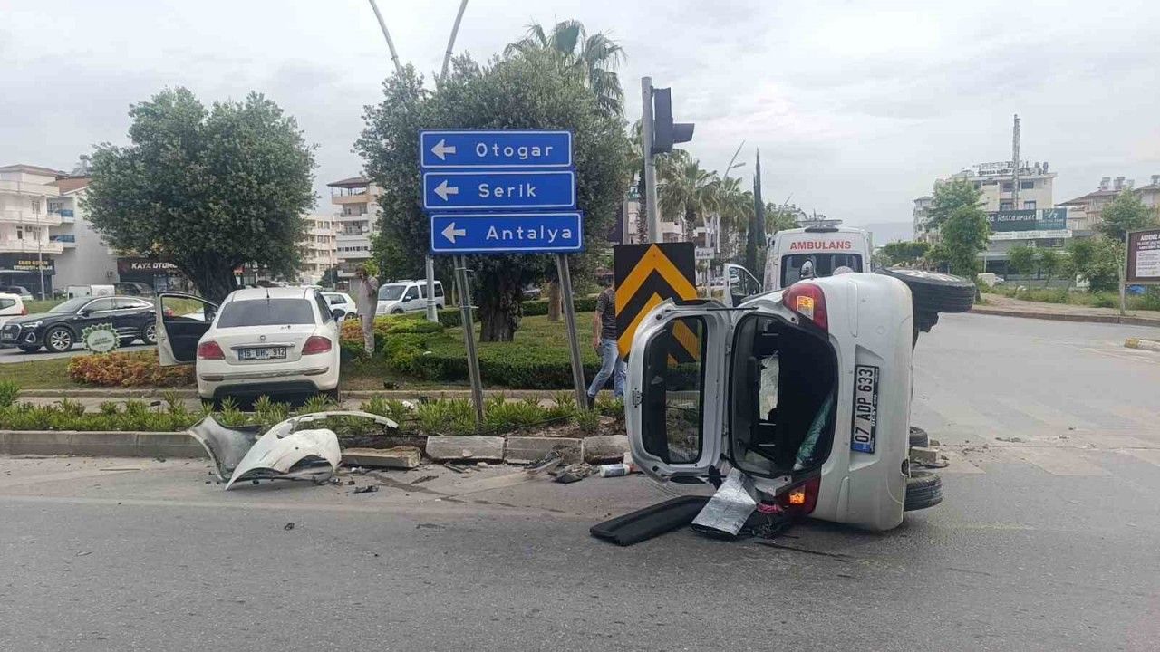 Antalya Manavgat’ta kavşakta 2 otomobilin çarpıştığı kazada araçlardan birisi devrilirken şans eseri yaralanan olmadı.