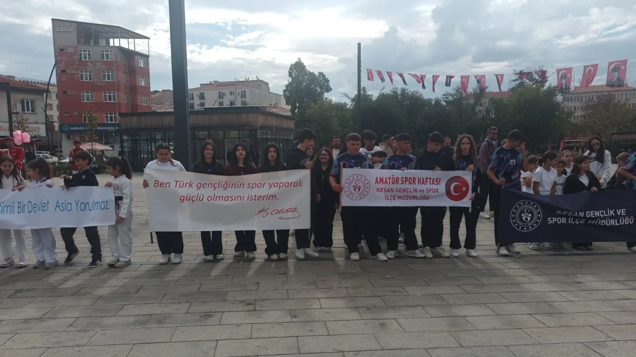 Edirne Keşan'da Cumhuriyet Meydanı'nda gerçekleşen tören Keşan İlçe Gençlik ve Spor Müdürü Vedat Çimen ile kulüplerin sporcuları ve antrenörler katıldı.