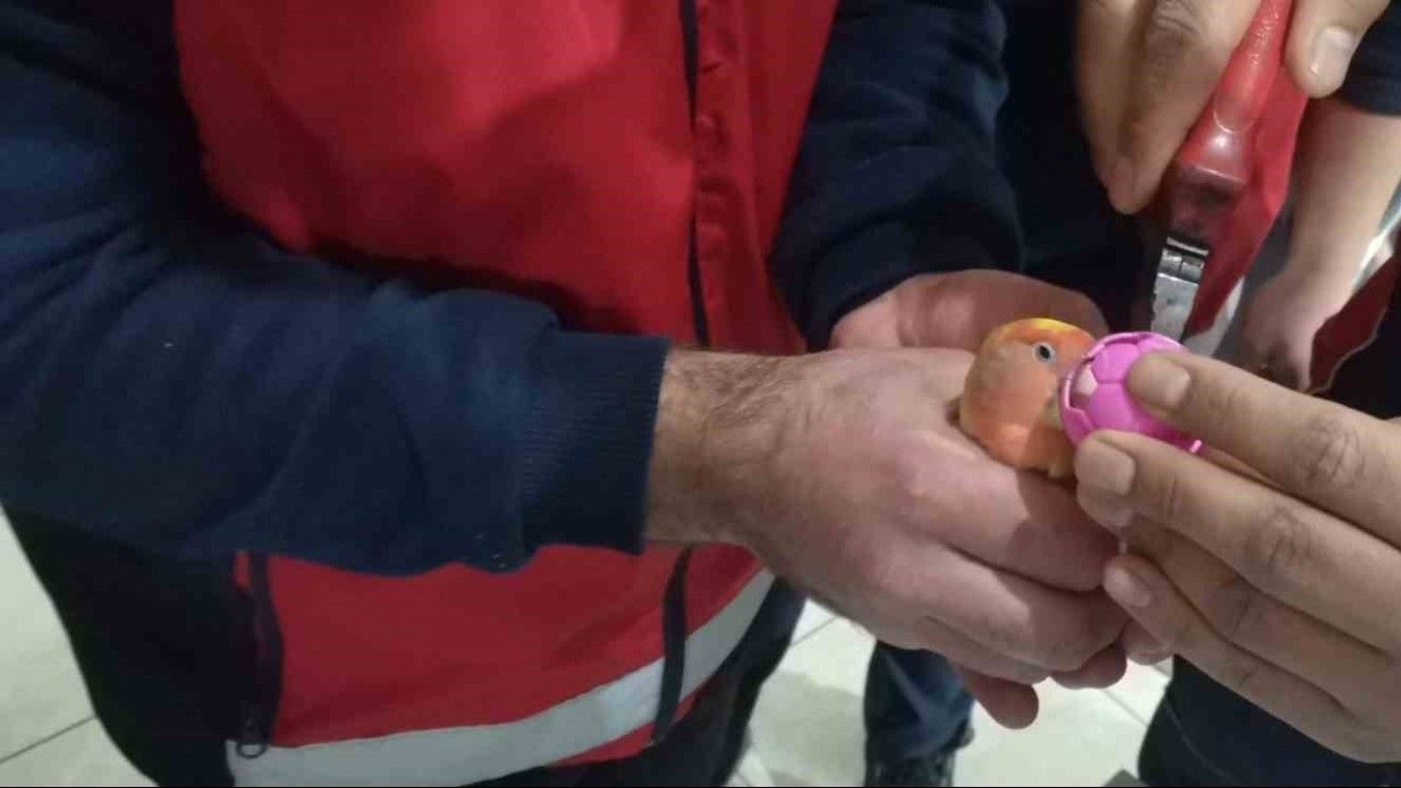 Melikgazi İlçesi’nde evinde beslediği cennet papağanının gagasına top sıkıştığını fark eden Arzu Bulut, Kayseri Büyükşehir Belediyesi İtfaiye Daire Başkanlığı ekiplerinden yardım istedi. Ekiplerce yapılan titiz bir çalışma sonucu papağanın gagası toptan kurtarıldı.