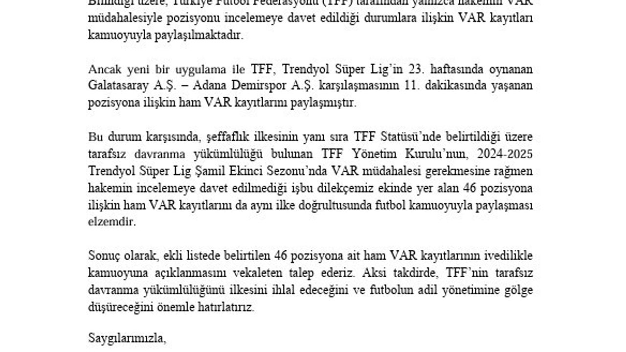 "Bilindiği üzere, Türkiye Futbol Federasyonu (TFF) tarafından yalnızca hakemin VAR müdahalesiyle pozisyonu incelemeye davet edildiği durumlara ilişkin VAR kayıtları kamuoyuyla paylaşılmaktadır. Ancak yeni bir uygulama ile TFF, Trendyol Süper Lig’in 23. haftasında oynanan Galatasaray - Adana Demirspor karşılaşmasının 11. dakikasında yaşanan pozisyona ilişkin ham VAR kayıtlarını paylaşmıştır. Bu durum karşısında, şeffaflık ilkesinin yanı sıra TFF Statüsü’nde belirtildiği üzere tarafsız davranma yükümlülüğü bulunan TFF Yönetim Kurulu’nun, 2024-2025 Trendyol Süper Lig Şamil Ekinci Sezonu’nda VAR müdahalesi gerekmesine rağmen hakemin incelemeye davet edilmediği işbu dilekçemiz ekinde yer alan 46 pozisyona ilişkin ham VAR kayıtlarını da aynı ilke doğrultusunda futbol kamuoyuyla paylaşması elzemdir. Sonuç olarak, ekli listede belirtilen 46 pozisyona ait ham VAR kayıtlarının ivedilikle kamuoyuna açıklanmasını vekaleten talep ederiz. Aksi takdirde, TFF’nin tarafsız davranma yükümlülüğünü ilkesini ihlal edeceğini ve futbolun adil yönetimine gölge düşüreceğini önemle hatırlatırız.