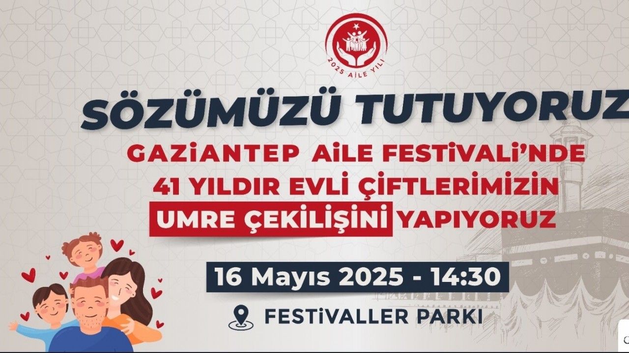 Festival, sadece eğlenceli vakit geçirmekle kalmayacak aynı zamanda festival takvimi içerisinde Gaziantep Büyükşehir Belediye Başkanı Fatma Şahin’in aile üyelerine bir dizi müjdeleri de olacak. Bu doğrultuda 16 Mayıs’ta Festivaller Parkı’nda saat 14.40’da Başkan Fatma Şahin, evliliğinde 41 yılı dolduran çiftlerin Umre çekilişini yapacak.