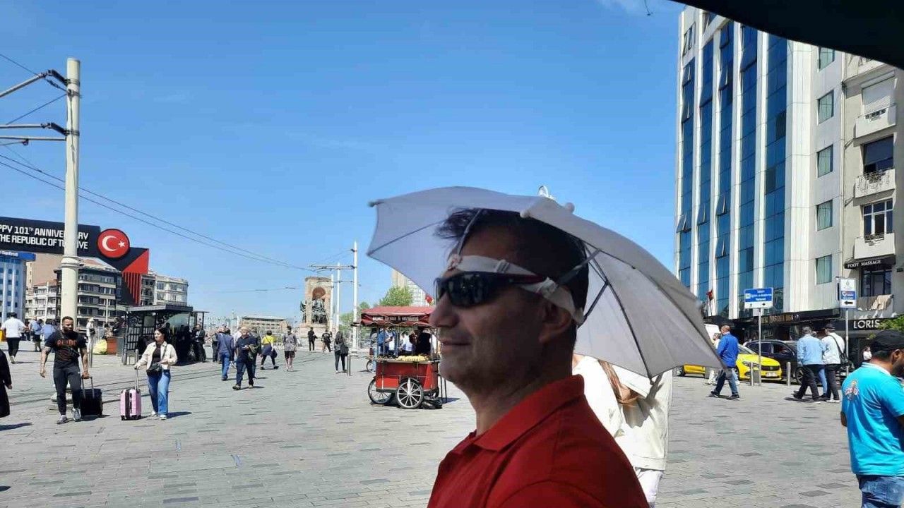 Geçtiğimiz haftaya kadar soğuk havanın hakim olduğu mega kent İstanbul’a bahar geldi. Sıcaklığın zaman zaman artması vatandaşları bunalttı. Taksim’de gezen yerli ve yabancı turistlerle esnaf sıcaktan korunmak için farklı çözüm yolları buldu. Bir esnaf kafasına taktığı ufak beyaz şemsiyeyle sıcaktan korunmaya çalıştı. Sıcak havanın yüzünü gösterdiği söyleyen esnaf, "Hava ısındı. Biz tedbirimizi aldık. Şemsiyemizi kafamıza taktık" dedi.