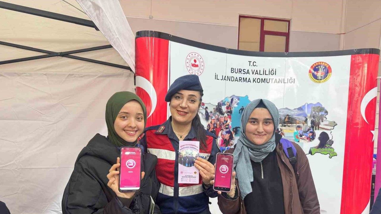 Bursa İl Jandarma Komutanlığı ekipleri, Mudanya’daki Kariyer Tanıtım Günü’nde 630 kadın ve kız öğrenciye KADES uygulaması hakkında bilgi verirken, 480 erkek öğrenciye de ’Kadına el kalkamaz’ mottosu ile tanıtım ve bilgilendirme broşürü dağıttı.