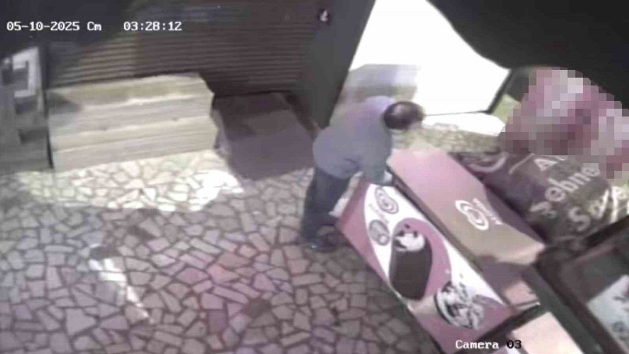 İstanbul Kadıköy’de gece saatlerinde kuruyemişçiye gelen hırsız, dondurma dolabındaki üç kutu dondurmayı alıp olay yerinden ayrıldı. O anlar dükkanın güvenlik kamerasına yansıdı.