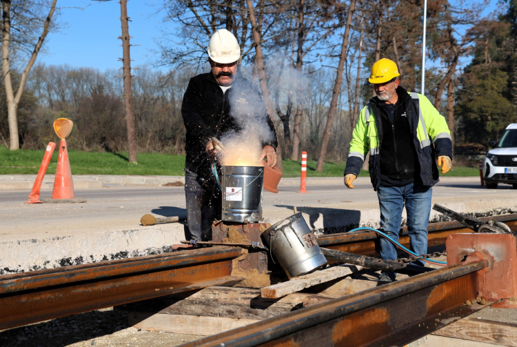 Kocaeli Büyükşehir Belediyesi, raylı sistem ağını bu kez 'Kartepe Tramvay Hattı' ile güçlendiriyor. Kenti demir ağlarla ören Büyükşehir, bu hatta döşenen raylarda kaynak işlemlerine başladı.