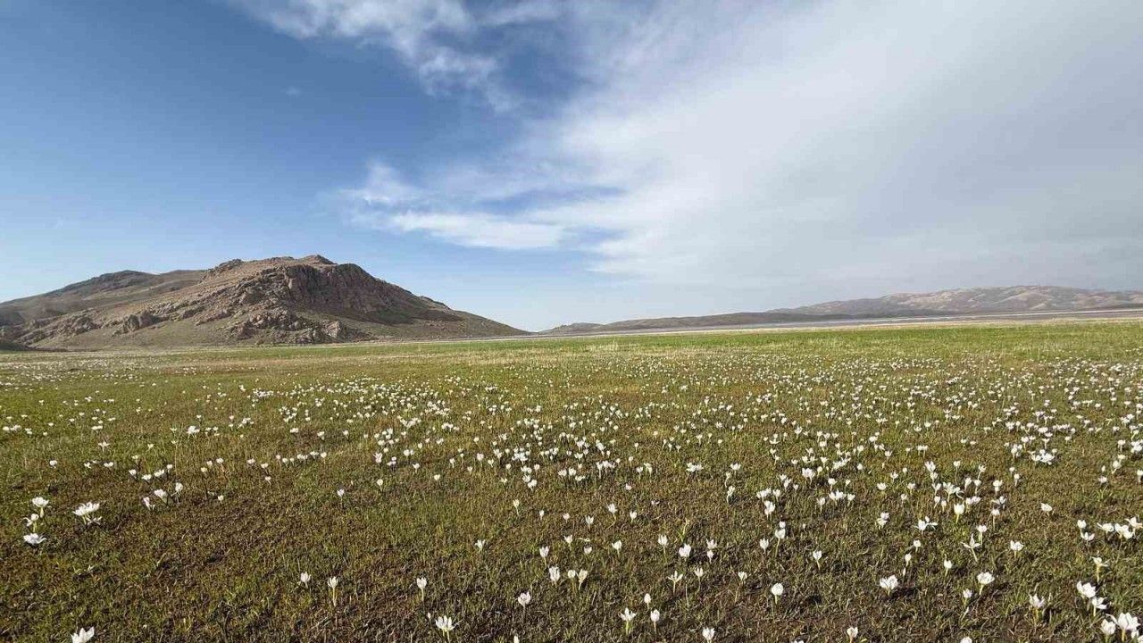 Van’ın Erek Dağı eteklerindeki 2 bin 550 rakımlı Keşiş (Turna) Gölü’nün çevresinde açan kardelenlerin oluşturduğu manzara göz kamaştırıyor.
