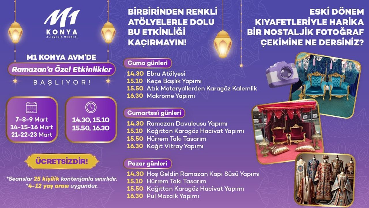 Fiba CP’nin yönetim faaliyetlerini üstlendiği M1 Konya AVM, Ramazan ayının manevi atmosferini çocuklar için özel etkinliklerle buluşturuyor. 7-8-9 Mart, 14-15-16 Mart ve 21-22-23 Mart tarihlerinde gerçekleştirilecek Ramazan temalı çocuk atölyeleri, minik ziyaretçilere hem eğlenceli hem de öğretici bir deneyim sunacak.