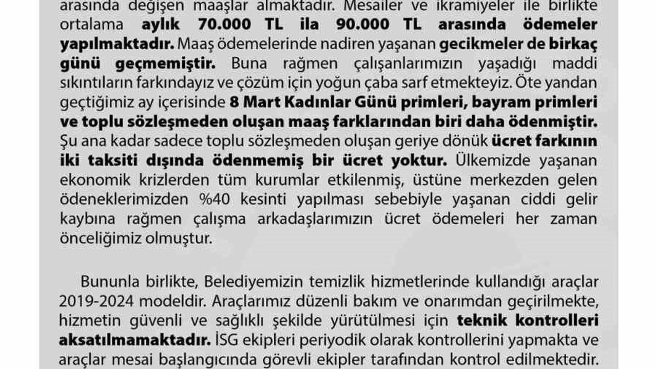 Açıklamada, "Çalışanlarımız fazla mesailer hariç, en düşük net 52.826 TL ile 66.240 TL arasında değişen maaşlar almaktadır. Mesailer ve ikramiyeler ile birlikte ortalama aylık 70.000 TL ila 90.000 TL arasında ödemeler yapılmaktadır. Maaş ödemelerinde nadiren yaşanan gecikmeler de birkaç günü geçmemiştir. Buna rağmen çalışanlarımızın yaşadığı maddi sıkıntıların farkındayız ve çözüm için yoğun çaba sarf etmekteyiz. Öte yandan geçtiğimiz ay içerisinde 8 Mart Kadınlar Günü primleri, bayram primleri ve toplu sözleşmeden oluşan maaş farklarından biri daha ödenmiştir. Şu ana kadar sadece toplu sözleşmeden oluşan geriye dönük ücret farkının iki taksiti dışında ödenmemiş bir ücret yoktur. Ülkemizde yaşanan ekonomik krizlerden tüm kurumlar etkilenmiş, üstüne merkezden gelen ödeneklerimizden yüzde 40 kesinti yapılması sebebiyle yaşanan ciddi gelir kaybına rağmen çalışma arkadaşlarımızın ücret ödemeleri her zaman önceliğimiz olmuştur." denildi.