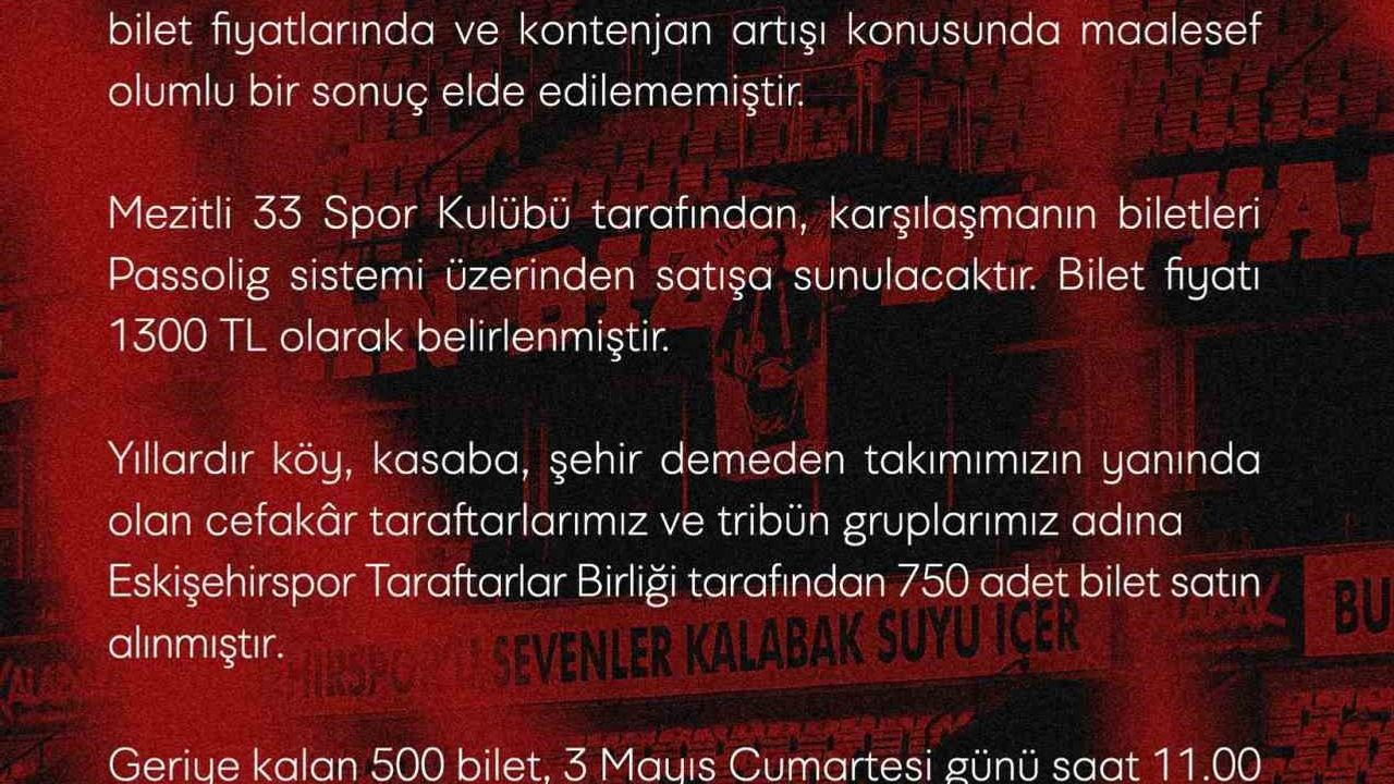 Açıklamanın devamında, "Yıllardır köy, kasaba, şehir demeden takımımızın yanında olan cefakâr taraftarlarımız ve tribün gruplarımız adına Eskişehirspor Taraftarlar Birliği tarafından 750 adet bilet satın alınmıştır, Geriye kalan 500 bilet, 3 Mayıs Cumartesi günü saat 11.00 itibarıyla Eskişehir Atatürk Stadyumu’muzdaki Passo Gişesi’nde satışa sunulacaktır. Bir kişiye en fazla 2 bilet satılacaktır. 1965’ten bu yana bozuk düzene karşı direnen camiamızla birlikte, bu mücadeleyle zaferle taçlandıracağız. Biz şampiyon olacağız" denildi.