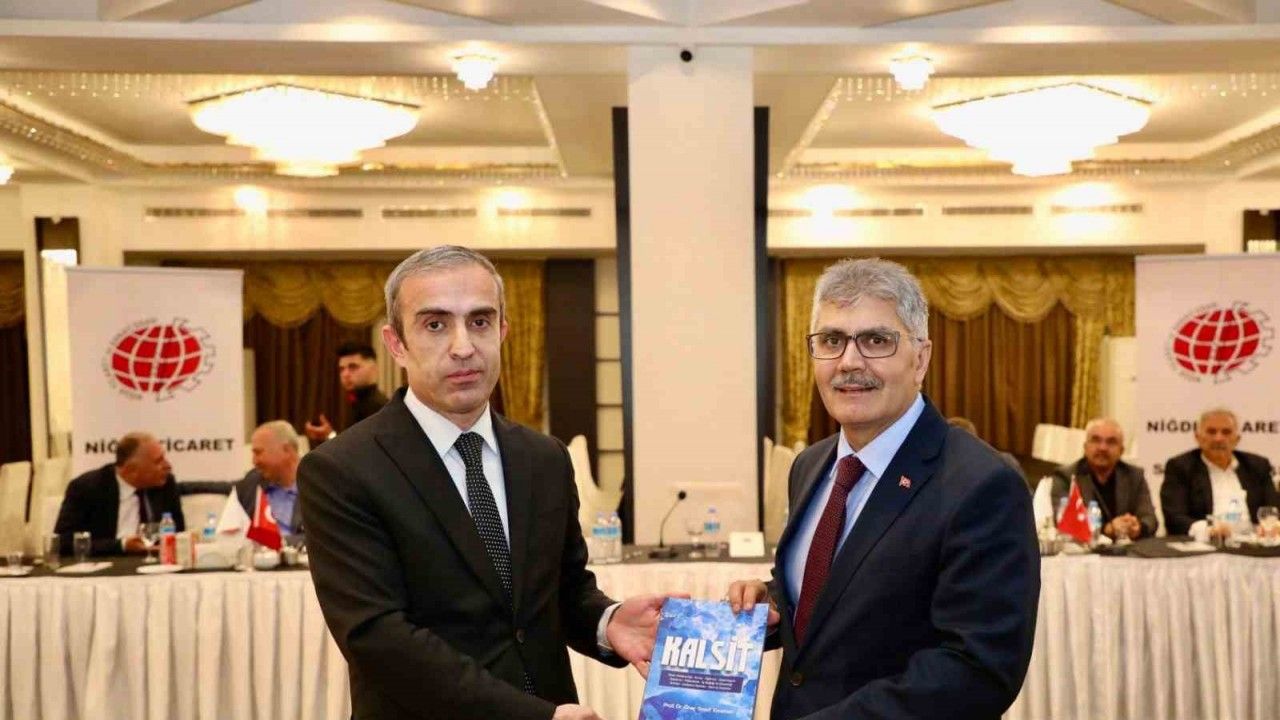 Programın sonunda Prof. Dr. Öner Yusuf Toroman, kalsit sektörüne dair akademik katkılarının bir örneği olan ’Kalsit’ adlı eserini Vali Cahit Çelik’e takdim etti. Toplantı, günün anısına çekilen hatıra fotoğrafıyla sona erdi.
