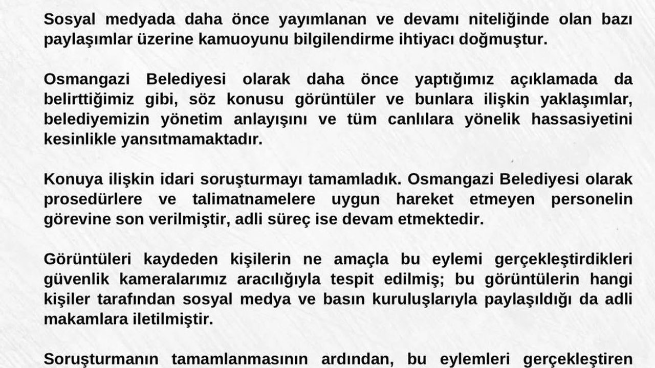 Osmangazi Belediyesi’nin sosyal medya hesabından yapılan açıklamada, "Sosyal medyada daha önce yayımlanan ve devamı niteliğinde olan bazı paylaşımlar üzerine kamuoyunu bilgilendirme ihtiyacı doğmuştur. Osmangazi Belediyesi olarak daha önce yaptığımız açıklamada da belirttiğimiz gibi, söz konusu görüntüler ve bunlara ilişkin yaklaşımlar, belediyemizin yönetim anlayışını ve tüm canlılara yönelik hassasiyetini kesinlikle yansıtmamaktadır. Konuya ilişkin idari soruşturmayı tamamladık. Osmangazi Belediyesi olarak prosedürlere ve talimatnamelere uygun hareket etmeyen personelin görevine son verilmiştir, adli süreç ise devam etmektedir. Görüntüleri kaydeden kişilerin ne amaçla bu eylemi gerçekleştirdikleri güvenlik kameralarımız aracılığıyla tespit edilmiş; bu görüntülerin hangi kişiler tarafından sosyal medya ve basın kuruluşlarıyla paylaşıldığı da adli makamlara iletilmiştir. Soruşturmanın tamamlanmasının ardından, bu eylemleri gerçekleştiren kişilerin hangi yaptırımlarla karşılaşacaklarına yüce Türk adaleti karar verecektir. Kamuoyuna saygıyla duyurulur" denildi.