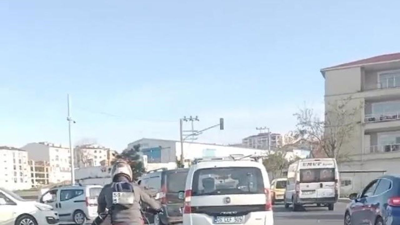Tekirdağ Çorlu’da bir motosikletlinin, yerinden çıkan plakayı sırtına takarak ilerlemesi bir vatandaşın cep telefonu kamerasına yansıdı.