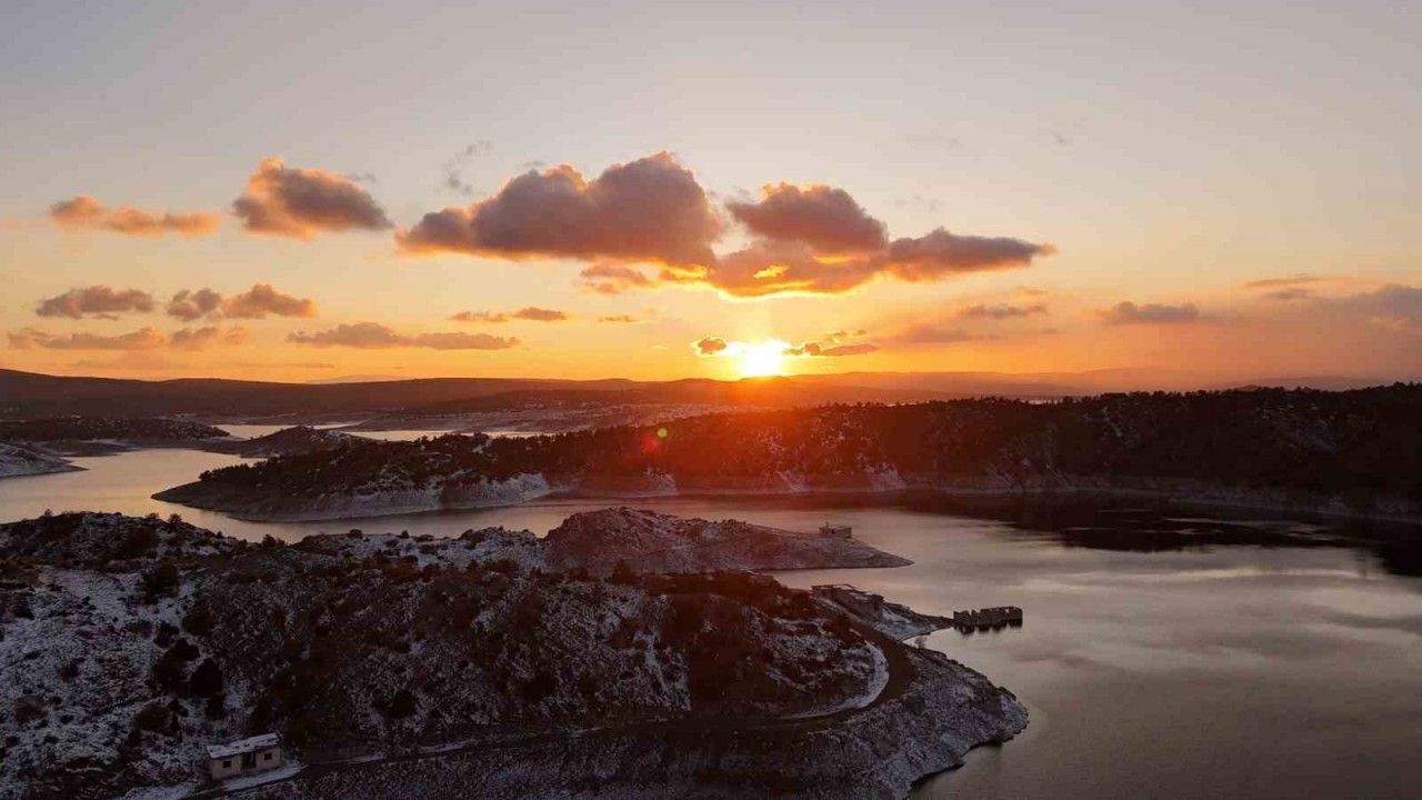 Eskişehir’de bulunan Porsuk Barajı’nın eşsiz günbatımı manzarası dron ile havadan görüntülendi.