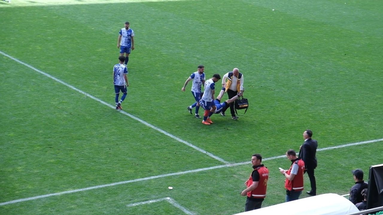 Erzincan 1. Amatör Küme play-off final maçında sedye olmayınca sakatlanan futbolcu karga tulumba saha kenarına taşındı.