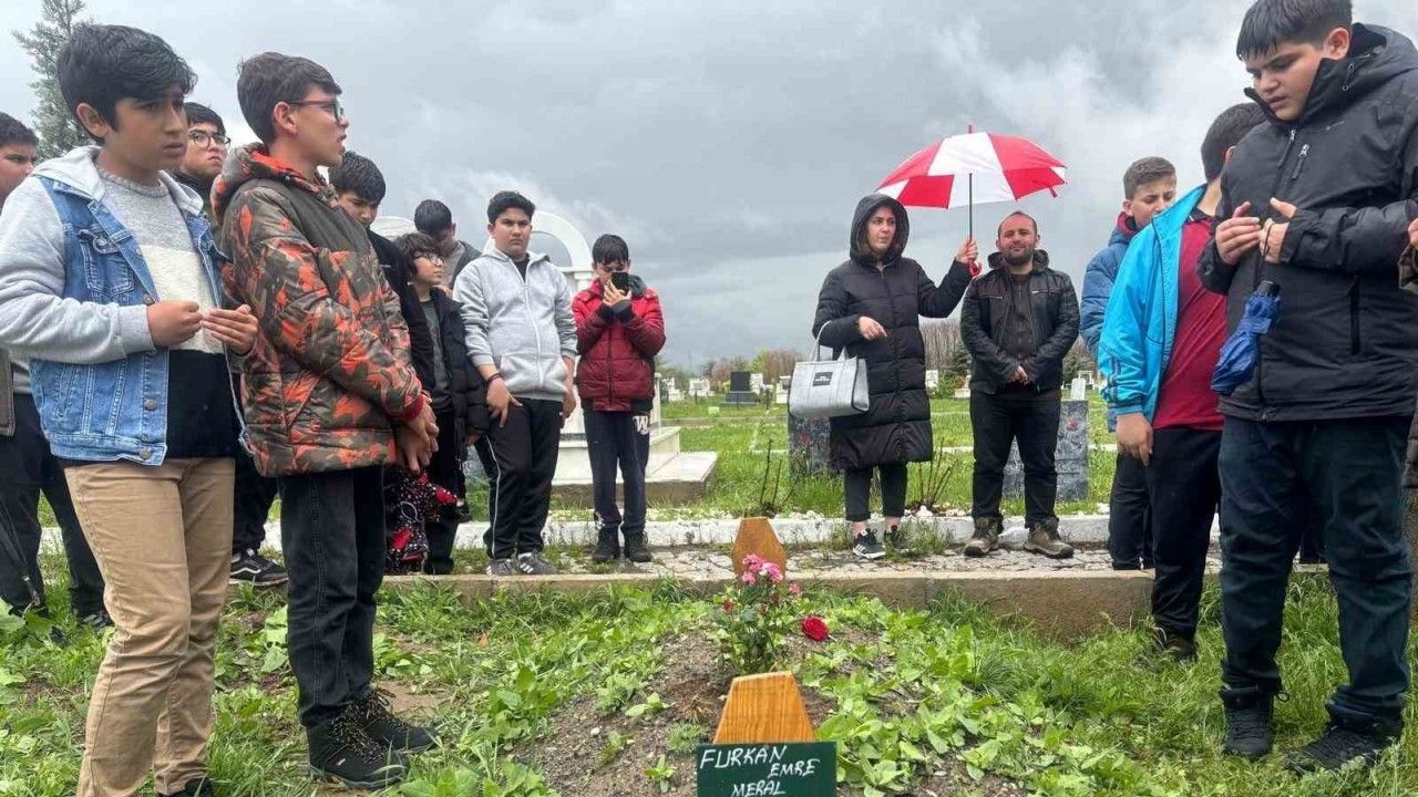 Küçük Furkan’ın Erzincan Pir-i Sami Hazretleri mezarlığındaki kabrini yağan yoğun yağmura rağmen ziyaret eden sınıf arkadaşları ve öğretmenleri Furkan Emre Meral’e dua ederek mezarına çiçek diktiler. Ziyarette öğretmen ve öğrenciler duygu dolu anlar yaşadılar.