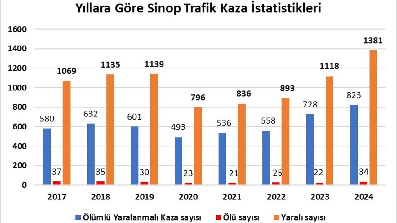 Sinop’ta, 2024 yılında son 8 yılın kaza rekoru yaşandı, 34 kişi hayatını kaybetti, bin 381 kişi yaralandı.