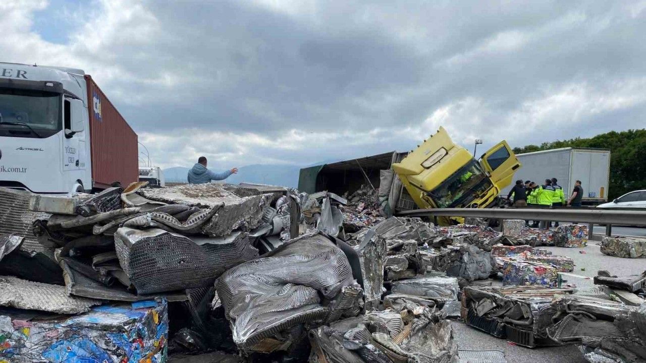 TEM Otoyolu’nun Kocaeli geçişinde hurda yüklü tır, demir bariyere çarptıktan sonra sürüklenerek yan yattı. Kazada tırda yüklü hurdalar yola saçılarak, trafiği olumsuz etkiledi.