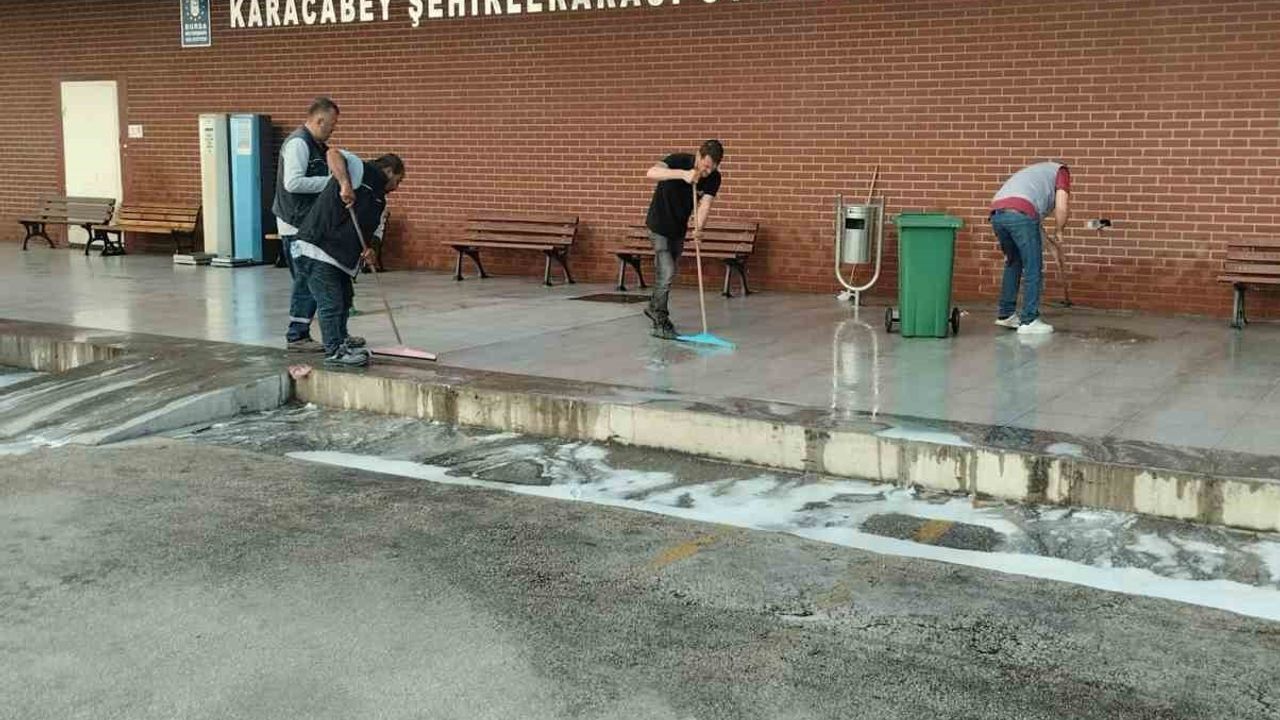 Temizlik çalışmaları kapsamında terminaldeki kirli ve kötü kokulara neden olabilecek alanlar dezenfekte edildi; zemindeki lekeler, toz ve atıklar basınçlı suyla temizlendi. Ayrıca, çevredeki çöp kutuları ve bekleme alanları da hijyenik hale getirildi.