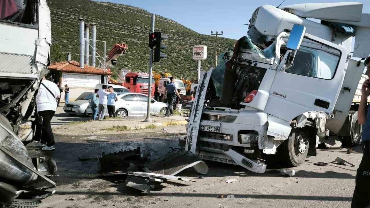 Denizli’nin Tavas ilçesinde kırmızı ışıkta bekleyen otobüs ve otomobile tırın çarpması sonucu meydana gelen trafik kazasında 6 kişi yaralandı.