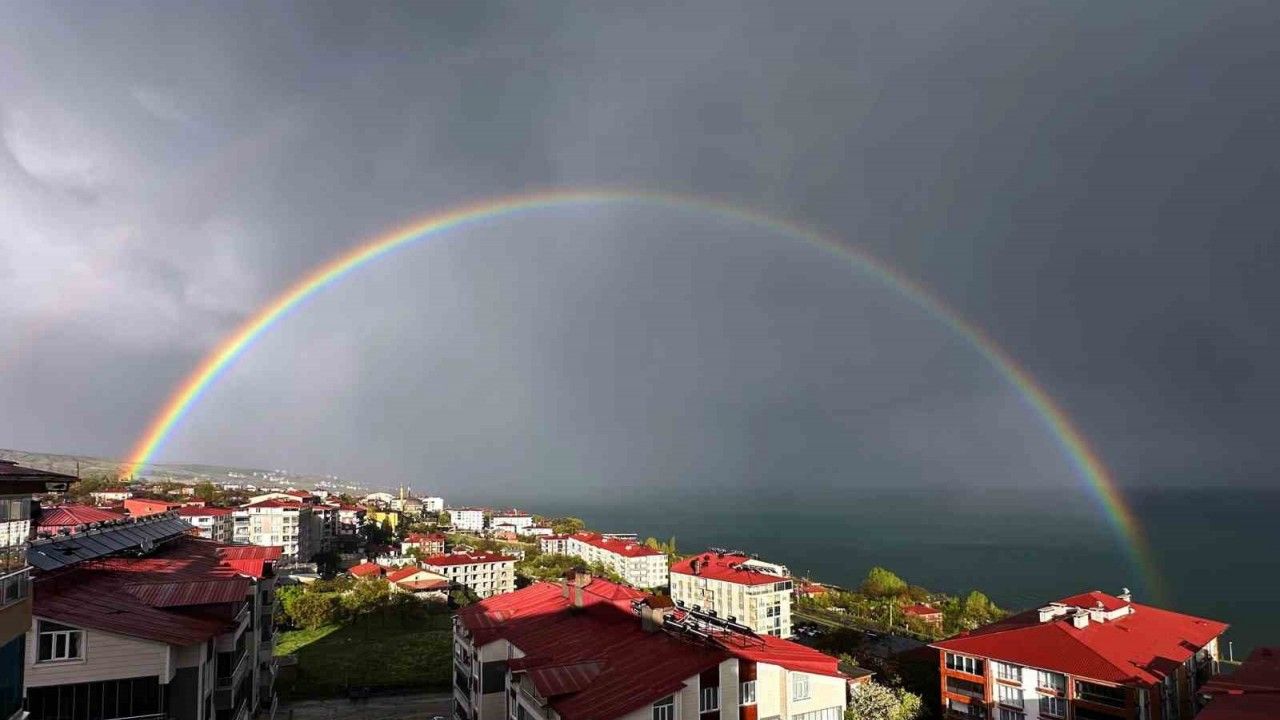 Bitlis’in Ahlat ilçesinde akşam saatlerinde yağmur sonrası açan güneş ile birlikte gökkuşağı oluştu. Bir ucu Van Gölü’nde diğer ucu da şehir merkezine doğru uzanan gökkuşağının oluşturduğu renk cümbüşü ilçede doğa fotoğrafçılığı yapan Bülent Akarsu tarafından görüntülendi. Seyrine doyumsuz manzara sunan gökkuşağı, yağmur bulutlarının dağılmasıyla kayboldu.