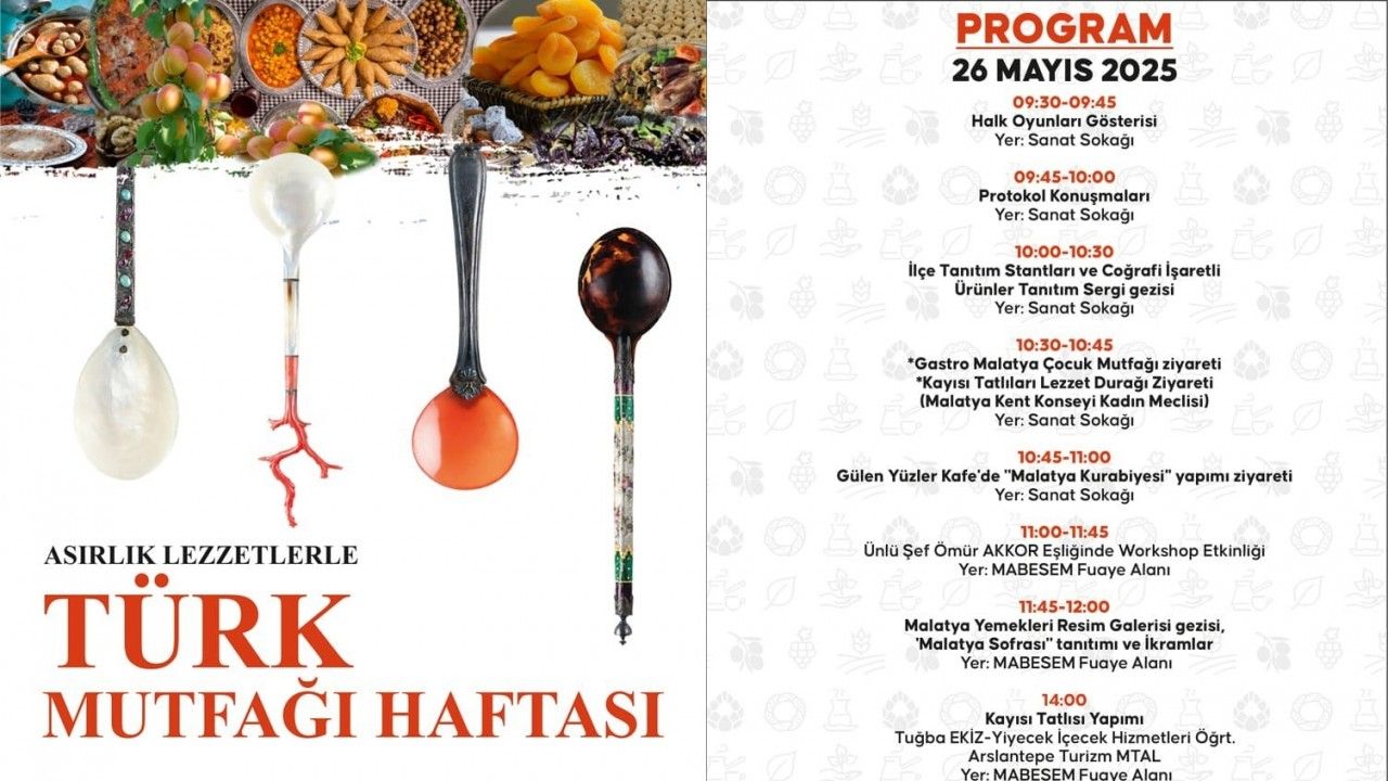 Bu yıl 4’üncüsü düzenlenen Asırlık Lezzetlerle Türk Mutfağı Haftası kapsamında, 26 Mayıs Pazartesi günü Sanat Sokağı’nda gerçekleştirilecek programlarla, Malatya’nın zengin mutfak mirası bir kez daha tanıtılacak.