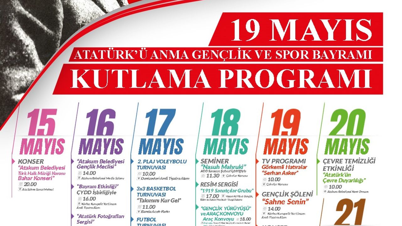 Kutlama programı, 15 Mayıs Perşembe günü saat 20.00’de Ata Sahne Sanat Merkezi’nde Atakum Belediyesi Türk Halk Müziği Korosunun "Bahar Konseri" ile başlayacak. 16 Mayıs Cuma günü saat 14.00’te Gençlik Meclisi, Belediye Meclis Toplantı Salonunda toplanacak. Aynı gün saat 16.00’da Kurupelit Yat Limanı Amfi Tiyatro Alanı’nda Çağdaş Yaşamı Destekleme Derneği iş birliğiyle "Bayram Etkinliği" düzenlenecek. Aynı akşam Ata Sahne’de saat 18.00’de "Atatürk Fotoğrafları Sergisi" açılacak. Saat 19.30’da ise Türk Halk Müziği Konseri ile sanatseverlere müzik ziyafeti sunulacak.