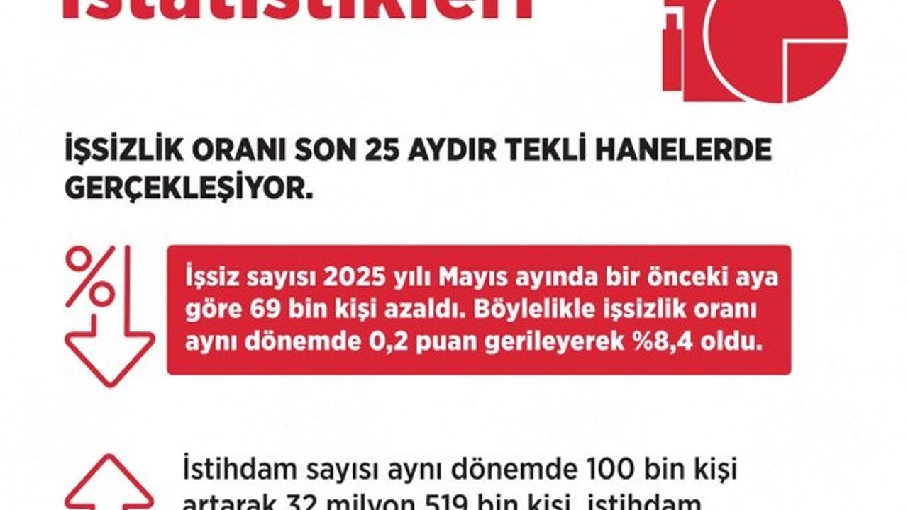 Çalışma ve Sosyal Güvenlik Bakanı Vedat Işıkhan, Türkiye İstatistik Kurumu’nun (TÜİK) mayıs ayı dış ticaret ve işgücü istatistikleri ile hizmet üretici fiyat endeksini açıklamasının ardından sosyal medya hesabından açıklamada bulundu. Yatırım, istihdam, üretim ve ihracat odaklı büyüme stratejilerinin işgücü verilerinde olumlu seyri devam ettirdiğini belirten Işıkhan, "Son 25 aydır tekli hanelerde gerçekleşen işsizlik oranı, bu yılın mayıs ayında bir önceki aya göre 0,2 puan azalarak yüzde 8,4 seviyesinde gerçekleşti. 69 bin kişi azalan işsiz sayısı, 2 milyon 972 bin kişiye geriledi. Genç nüfusta da azalan işsizlik oranı, aynı dönemde 0,3 puan gerileyerek yüzde 15,4 oldu" ifadelerine yer verdi.