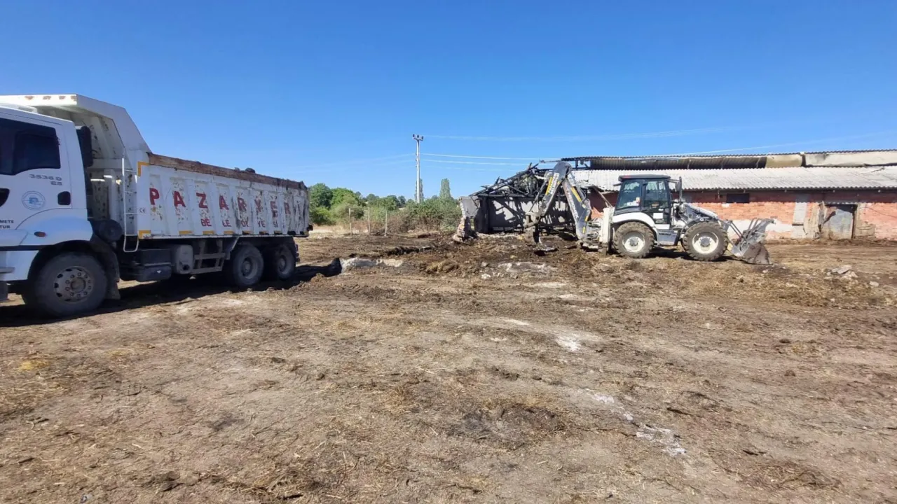 Bilecik’in Pazaryeri ilçesinde geçtiğimiz hafta art arda iki kez çıkan yangında ağır hasar gören Hüseyin Çakır’a ait çiftlikte, Pazaryeri Belediyesi ekipleri temizlik çalışması yaptı.Pazaryeri Gündem / BİLECİK (İGFA) - Bilecik'te Pazaryeri Belediye Başkanı Zekiye Tekin, yaşanan acının büyüklüğüne dikkat çekerek, yangında yalnızca besihane ve hayvan yemlerinin değil, çiftçinin umutlarının da kül olduğunu belirtti.