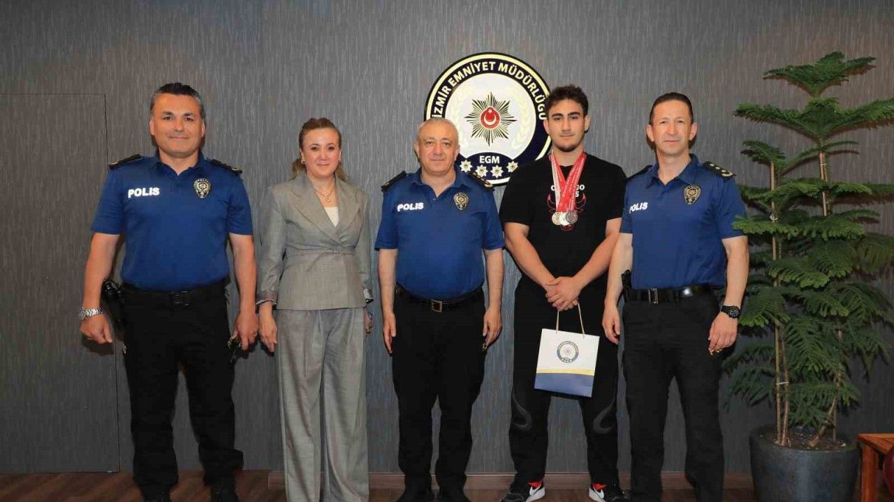 Genç Erkekler Bilek Güreşi Türkiye Finalleri’nde Türkiye ikincisi olma başarısını gösteren, babası Foça İlçe Emniyet Müdürü, annesi de Karşıyaka İlçe Emniyet Müdürlüğünde görevli başkomiser olan Taha Çaylak, İzmir İl Emniyet Müdürü Celal Sel tarafından makamında ağırlandı.