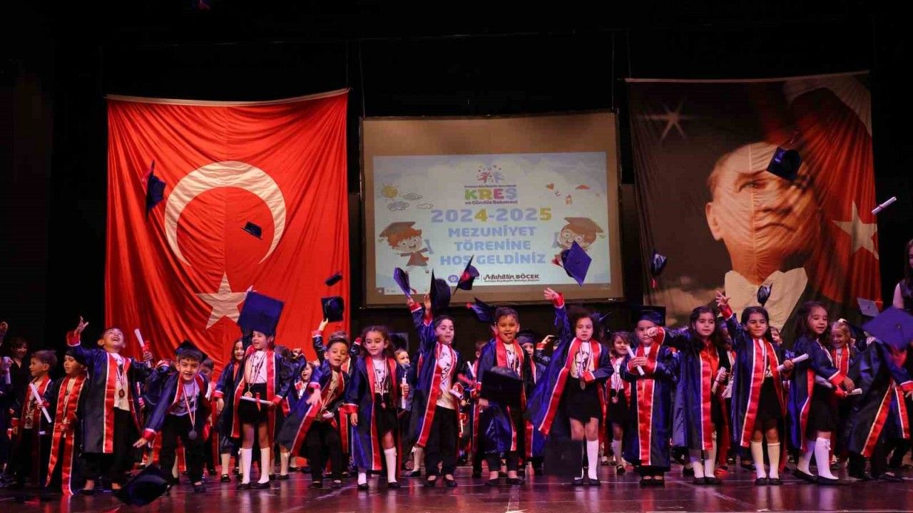 Antalya Büyükşehir Belediyesi bünyesinde hizmet veren kreş ve gündüz bakımevlerinde eğitim gören çocuklara özel yıl sonu mezuniyet töreni düzenlendi. Program sonunda diplomalarını alan minikler, kep fırlatarak mezuniyetlerini kutladı.