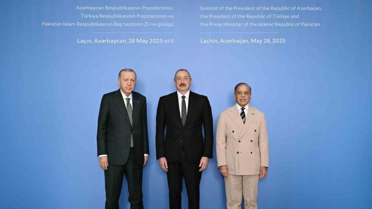 Cumhurbaşkanı Recep Tayyip Erdoğan, Ermenistan işgalinden kurtarılan Laçın şehrinde düzenlenen Türkiye-Azerbaycan-Pakistan Üçlü Zirvesi’nin ikinci toplantısına katıldı. Cumhurbaşkanı Erdoğan, Azerbaycan Cumhurbaşkanı İlham Aliyev ve Pakistan Başbakanı Şahbaz Şerif ile birlikte aile fotoğrafı çektirdi. Üç lider, daha sonra ayak üstü sohbet etti.