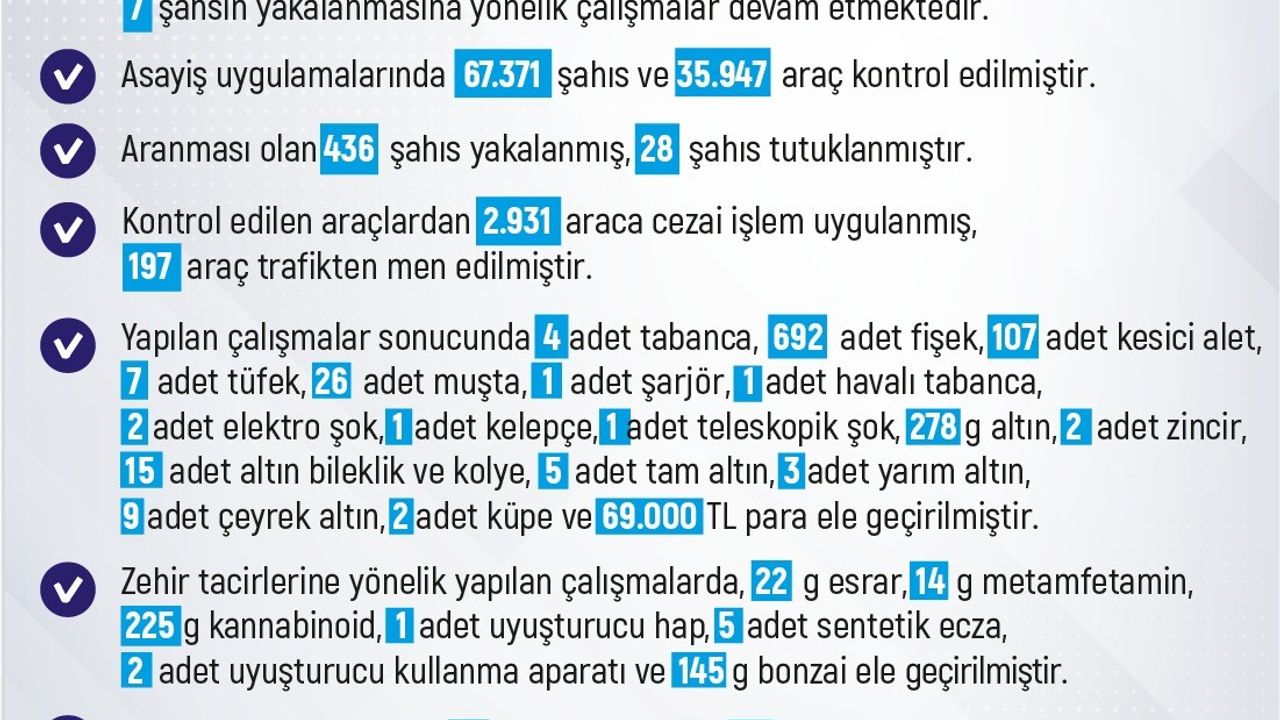 Elazığ Valiliği, 23-29 Haziran arasında meydana gelen olaylar ile güvenlik güçlerinin çalışmalarını paylaştı. Buna göre son bir hafta içerisinde 247 olay meydana gelirken, 240 kişi yakalandı, 6 şahıs ise tutuklanarak cezaevine gönderildi. Asayiş uygulamalarında 63 bin 371 şahıs ve 35 bin 947 araç kontrol edildi. Araması olan 436 şahıs yakalanırken, 28 şahıs tutuklandı. Kontrol edilen araçlardan 2 bin 931’ine ceza kesilirken, 197 araç trafikten men edildi. Yapılan çalışmalarda 4 adet tabanca, 692 adet fişek, 197 adet kesici alet, 7 adet tüfek, 26 adet muşta, 1 adet şarjör, 1 adet havalı tabanca, 2 adet elektroşok, 1 adet kelepçe, 1 adet teleskopik şok, 278 gram altın, 2 adet zincir, 15 adet altın bileklik ve kolye, 5 adet tam altın, 3 adet yarım altın, 9 adet çeyrek altın, 2 adet küpe ve 69 bin lira ele geçirildi.
