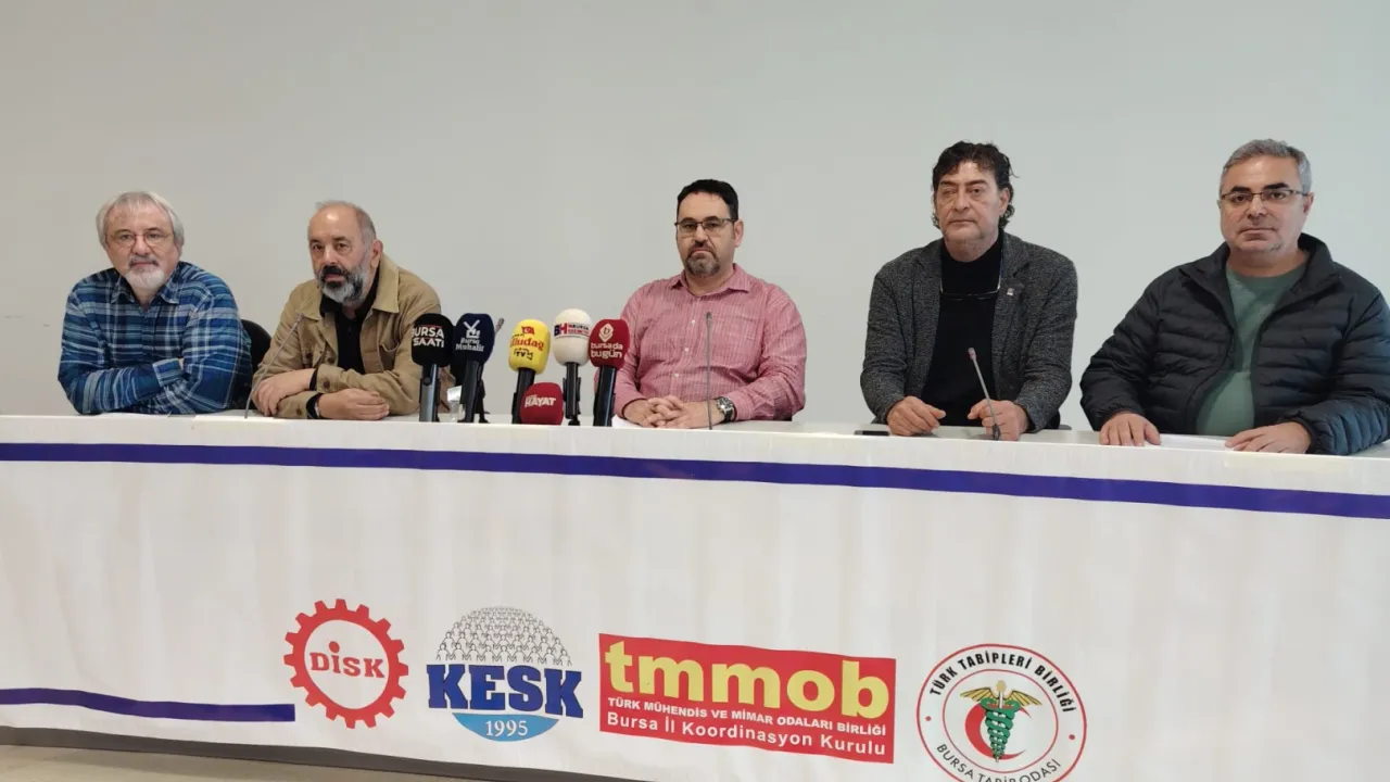 Bursa'da DİSK, KESK, TMMOB ve TTB bileşenleri, 5 Kasım Çarşamba günü BAOB Ortak Salon'da bir basın açıklaması düzenleyerek, 2026 yılında elektrik faturalarında yüzde 97'lik artış öngören yeni düzenlemeye tepki gösterdi.