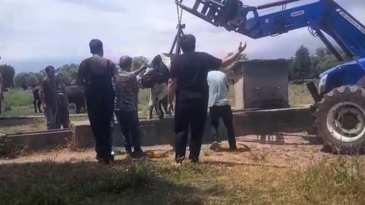 Bolu’da Yazören köyünde merada otlayan bir inek, su içmek için yaklaştığı oluğun içine girerek sıkıştı. Köylüler ineği kurtarmak için seferber oldu.
