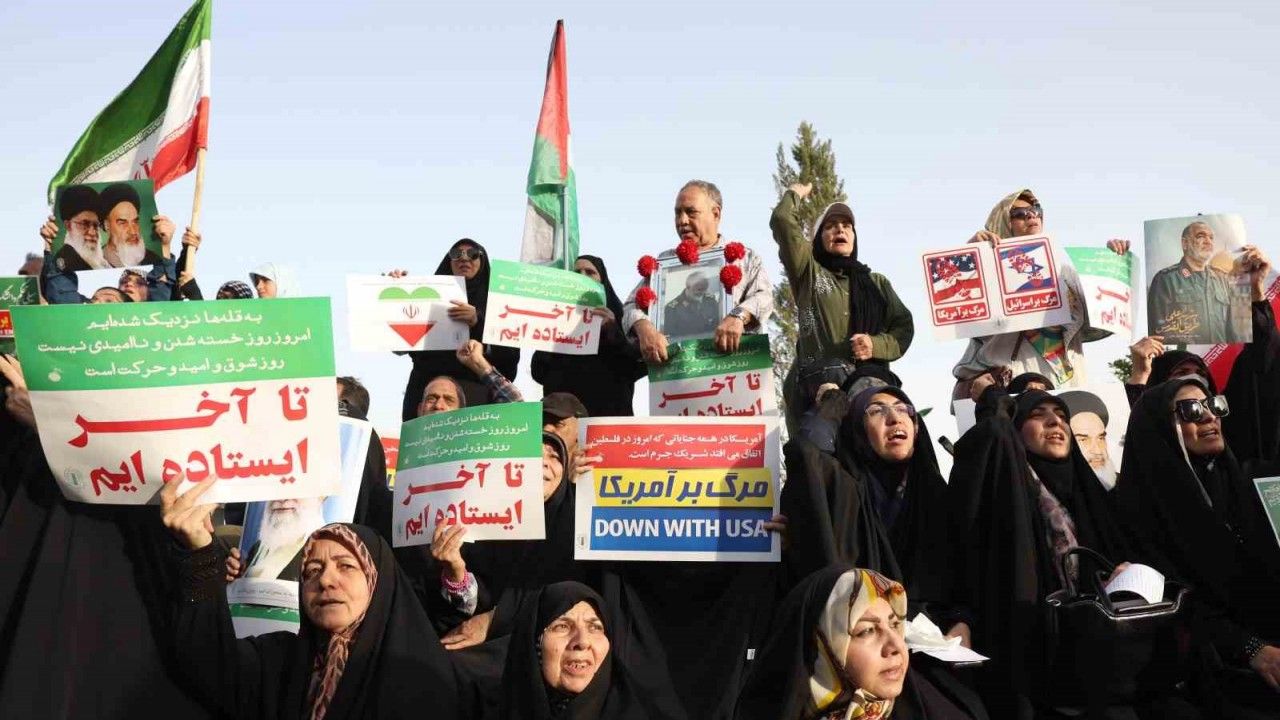 Göstericiler, "Cezalandırma devam ediyor", "İran kazandı", "Liderimizin arkasındayız", "Nükleer silah hakkımız" ve "Biz savaşmayı bilen bir milletiz" sloganları attı. İran Silahlı Kuvvetleri ve Devrim Muhafızları’na destek mesajlarının öne çıktığı gösteride, "Kahrolsun İsrail", "Kahrolsun ABD", "Siyonist rejim yok olacak", "Liderime canım feda" ve "Taviz yok" yazılı pankartlar taşındı.