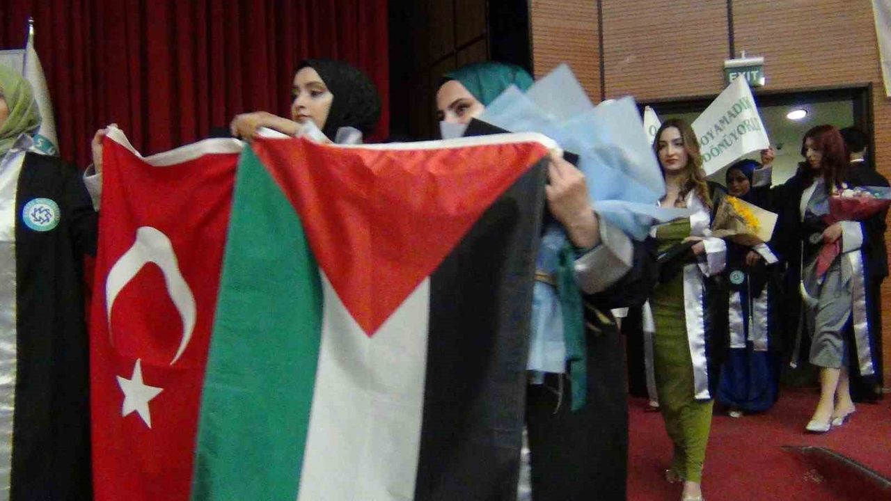 Kars’ta üniversite öğrencilerinin mezuniyet sevinci, öğrenciler, Türk, Filistin ve Doğu Türkistan bayrakları açtı.