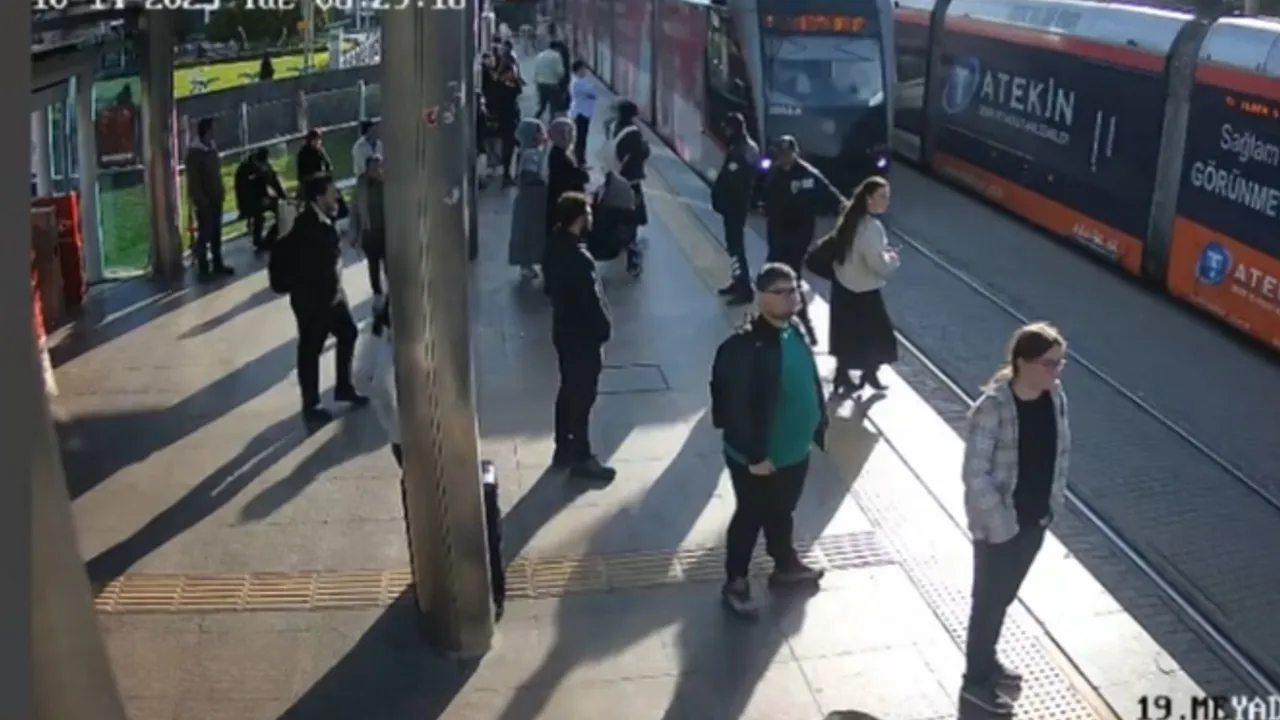 Cumhuriyet Meydanı Raylı Sistem İstasyonu'nda karşıya geçmek isteyen genç bir yolcu, kulaklık taktığı için yaklaşan tramvayı fark etmedi. O esnada görev başında olan güvenlik personelinin hızlı refleksi sayesinde genç yolcu raylara girmeden son anda durdurularak olası bir kazadan kurtarıldı.