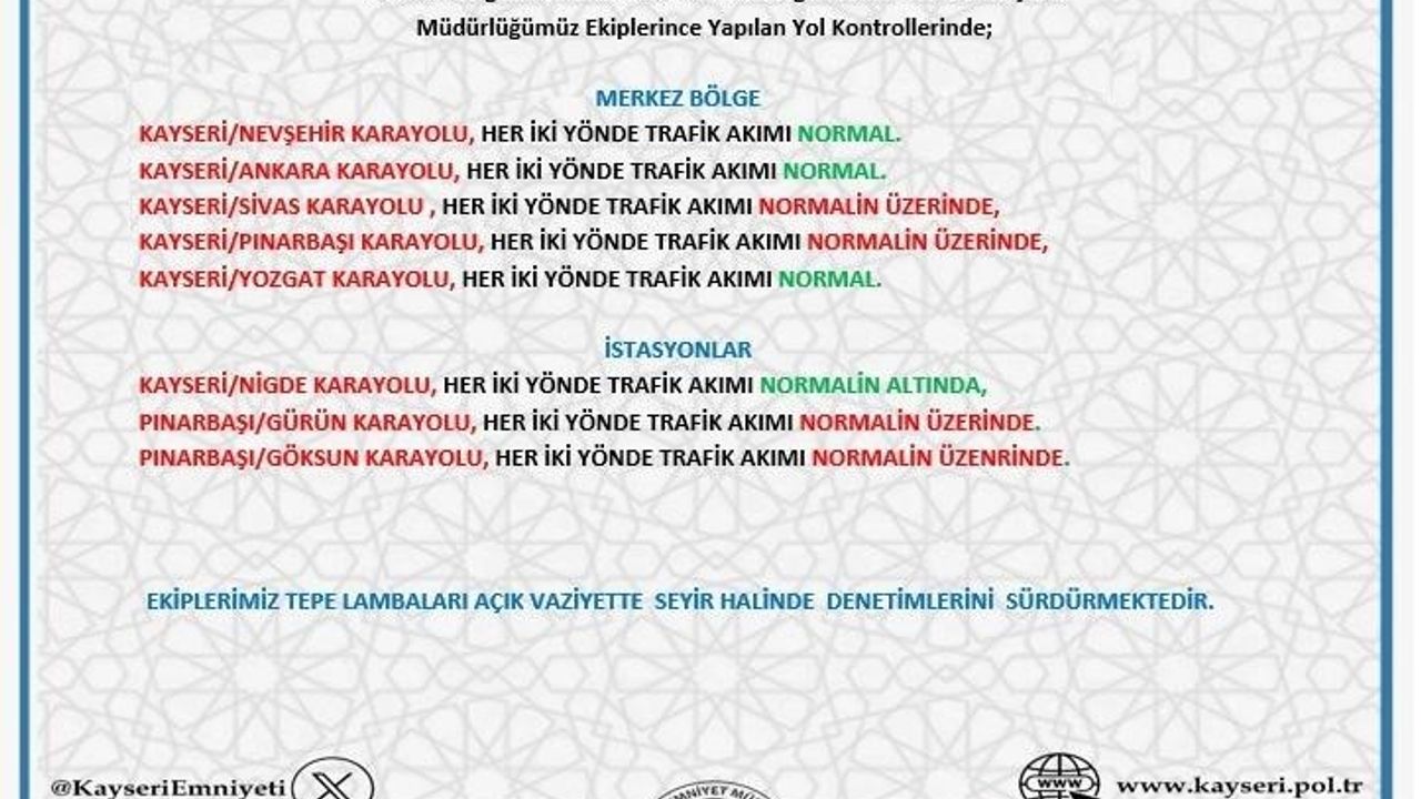 Kayseri Bölge Trafik Denetleme Şube Müdürlüğü tarafından yapılan denetimlerde, trafik akımı Kayseri-Nevşehir yolunda her iki yönde normal, Kayseri-Ankara yolunda her iki yönde normal, Kayseri-Sivas yolu her iki yönde normalin üzerinde, Kayseri-Pınarbaşı yolu her iki yönde normalin üzerinde, Kayseri-Yozgat yolunda her iki yönde normal olarak bildirildi.